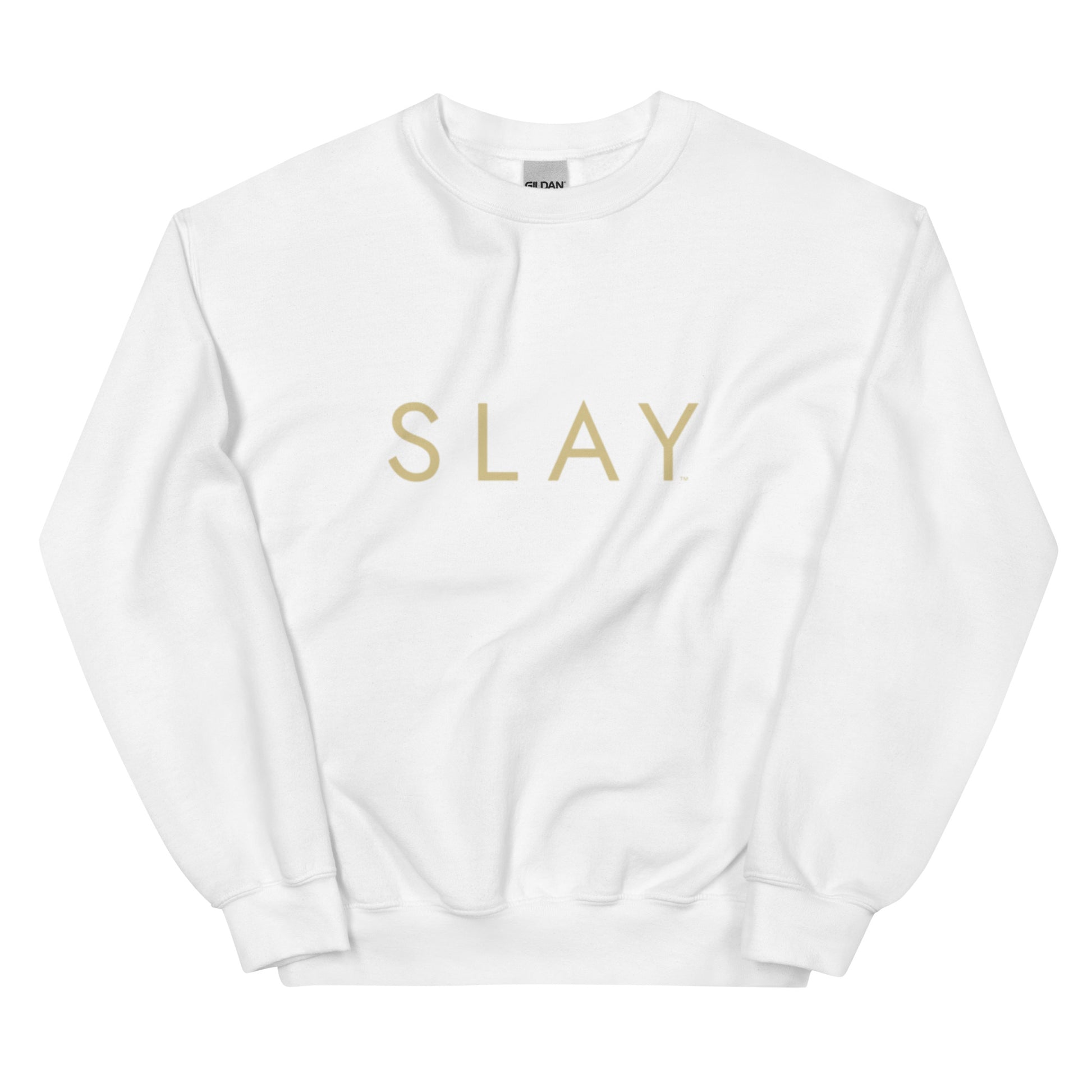 SLAY the day all day with this motivational sweatshirt! A sturdy and warm sweatshirt bound to keep you warm in the colder months. A pre-shrunk, classic fit sweater that's made with air-jet spun yarn for a soft feel and reduced pilling.